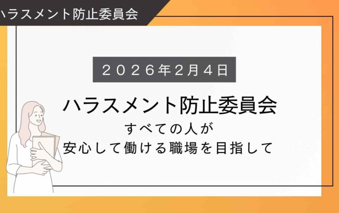 【ハラスメント防止委員会】~すべての人が安心して働ける職場を目指して~ハラスメント防止委員会とは…すべての従業員が尊重され、安心して働ける職場環境を実現するための委員会です。・予防……研修・啓発活動を通じた予防施策・早期発見……相談窓口による早期把握・適切な対応……公平・公正な調査と措置・再発防止……継続的な改善活動設置の背景職場におけるハラスメントは、個人の尊