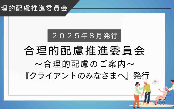 『合理的配慮のご案内 クライアントのみなさまへ』2025年8月発行合理的配慮推進委員会では、全ての従業員が安心して働ける職場づくりを目指して「合理的配慮のご案内 クライアントのみなさまへ」を作成し、2025 年 8 月に発行。全国の土屋グループの各事業所及びクライアントに配布いたしました。『合理的配慮のご案内』を見る「合理的配慮」とは合理的配慮とは、障害が有っても無