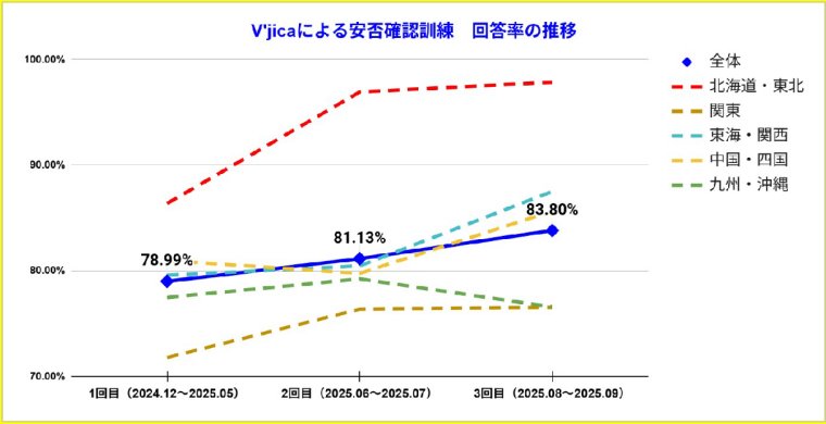 計3回の訓練を通じ、全体の回答率は78.99%→81.13%→83.80%と推移しました。