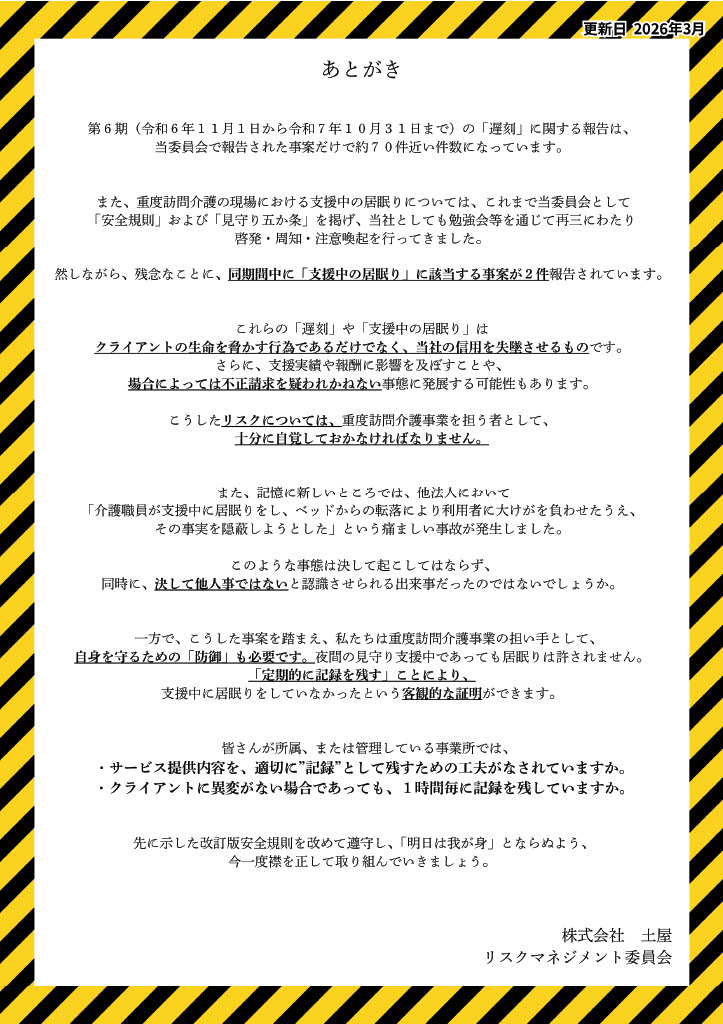 本改訂版「安全規則」は、2026年3月以降、ホームケア土屋の全事業所において掲示いたします。