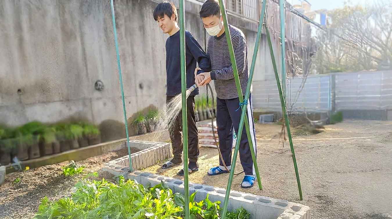 庭で水撒きをしている写真は、ご本人の残存機能を活かす「自立支援」として、ご家族と相談して日常の活動に取り入れたものです。